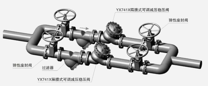 SYX741X 可調式減壓穩壓閥能夠控制閥門的固定出口壓力,使閥門的出口壓力不受進口壓力以及流量的變化影響,減壓效果可靠;且只需調節先導閥的調節螺釘,就能獲得精確穩定的出口壓力。